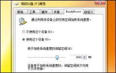 在彈出的屬性面板中,選擇“ReadyBoost”標(biāo)簽,之后選擇“使用這個(gè)設(shè)備”和“用于加速系統(tǒng)的保留空間”(也就是選擇使用多少U 盤(pán)空間作為內(nèi)存來(lái)使用),點(diǎn)擊“確定”按鈕,您的電腦就加速成功啦!