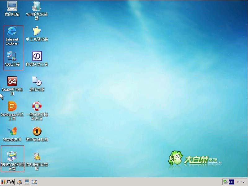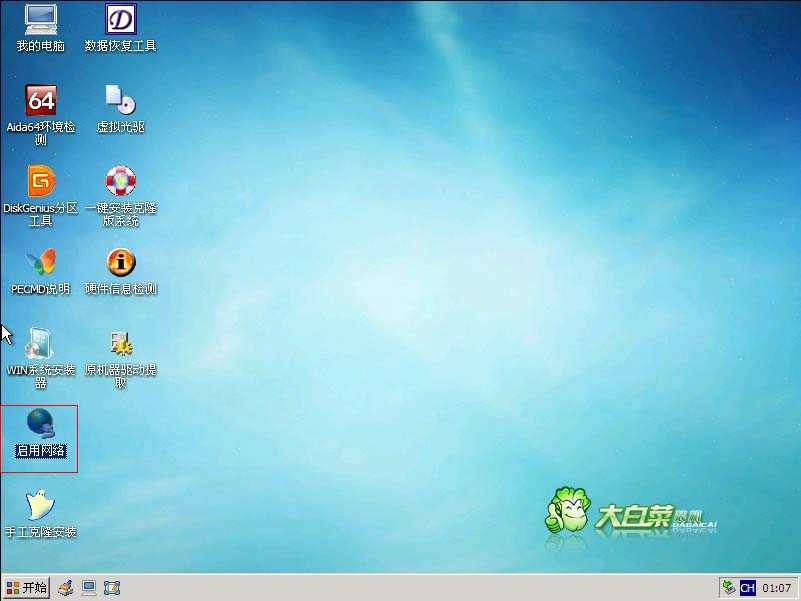 1.點擊大白菜PE桌面“啟用網(wǎng)絡”圖標