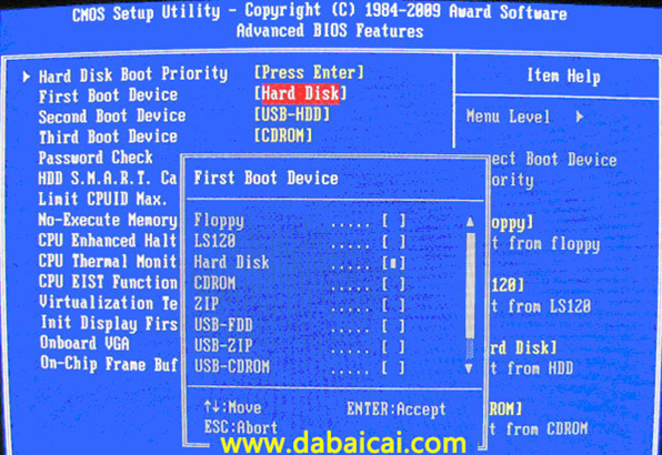 上圖4:在第一啟動(dòng)設(shè)備(First Boot Device)這里,有U盤的USB-ZIP、USB-HDD之類的選項(xiàng),我們既可以選擇“Hard Disk”,也可以選擇“USB-HDD”之類的選項(xiàng),來啟動(dòng)電腦。