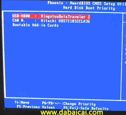 上圖3:硬盤啟動(dòng)優(yōu)先級(jí)(Hard Disk Boot Priority)選擇:使用小鍵盤上的加減號(hào)“+、-”來選擇與移動(dòng)設(shè)備,將U盤選擇在最上面。然后,按ESC鍵退出,回到圖2的設(shè)置界面。