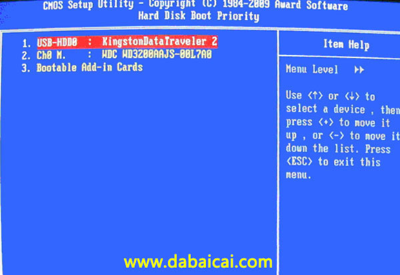 上圖3: 硬盤啟動(dòng)優(yōu)先級(jí)(Hard Disk Boot Priority)選擇:使用小鍵盤上的加減號(hào)“+、-”來選擇與移動(dòng)設(shè)備,將U盤選擇在最上面。然后,按ESC鍵退出,回到圖2的設(shè)置界面。