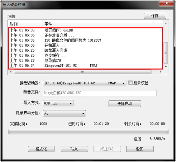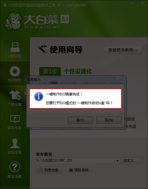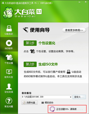按鈕后程序會(huì)在“D:\大白菜ISO\”文件夾下創(chuàng)建DBC.ISO鏡像。