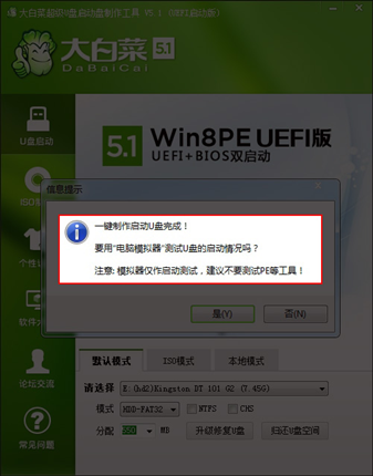 默認(rèn)模式1.4:制作過程根據(jù)電腦配置和U盤芯片的不同耗時(shí)長(zhǎng)短也不同,請(qǐng)耐心等待。制作完成后正確設(shè)置電腦BIOS(設(shè)置方法請(qǐng)參照設(shè)置U盤啟動(dòng)教程)即可U盤啟動(dòng)了。為了驗(yàn)證U盤啟動(dòng)制作是否成功,可以運(yùn)行模擬啟動(dòng)。